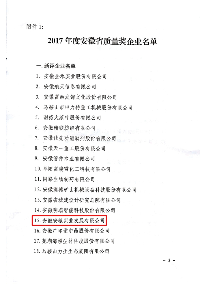 熱烈祝賀安糧實(shí)業(yè)榮獲“2017年度安徽省質(zhì)量獎(jiǎng)”