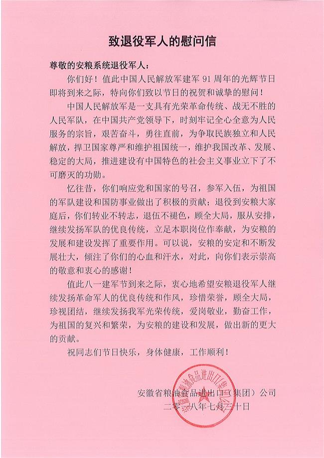中國人民解放軍建軍91周年節(jié)日前夕,根據(jù)集團黨委的部署,集團工會慰問了安糧系統(tǒng)全體退役軍人,向他們送上節(jié)日的問候和美好的祝愿!