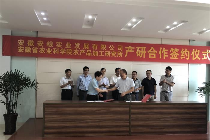 2018年9月19日,安徽省農(nóng)業(yè)科學(xué)院副院長畢小彬、農(nóng)產(chǎn)品加工研究所所長錢坤等一行六人在安糧集團(tuán)黨委委員、監(jiān)事會主席曹訓(xùn)立,安糧實業(yè)董事長吳國杰的陪同下,來到安糧(巢湖)食品工業(yè)園進(jìn)行調(diào)研考察并簽訂了產(chǎn)研合作戰(zhàn)略協(xié)議。