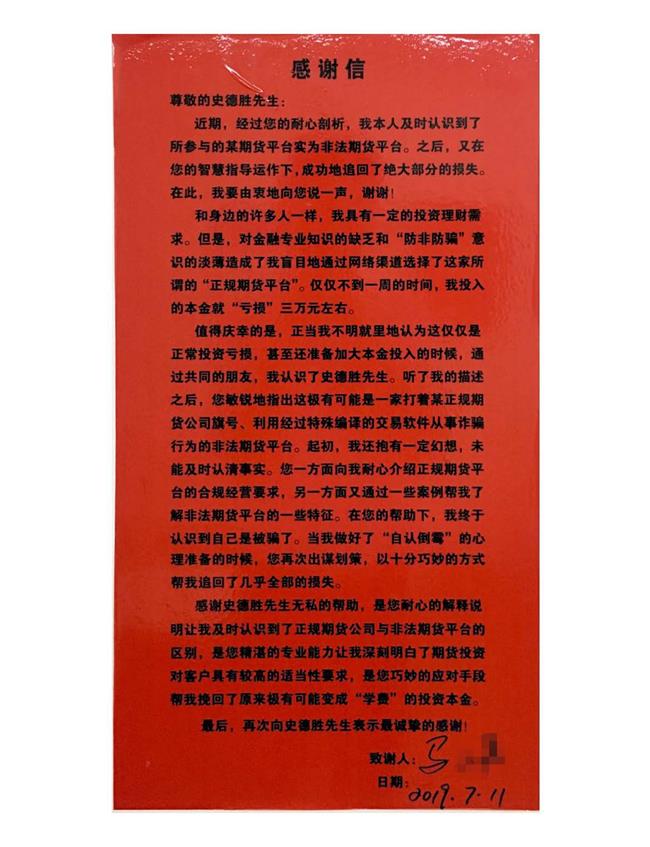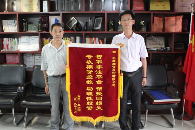 7月11日,安糧期貨股份有限公司收到了投資者親自送來的感謝信和錦旗,感謝安糧期貨市場部總經理史德勝同志幫助他成功挽回了在非法期貨平臺造成的經濟損失。