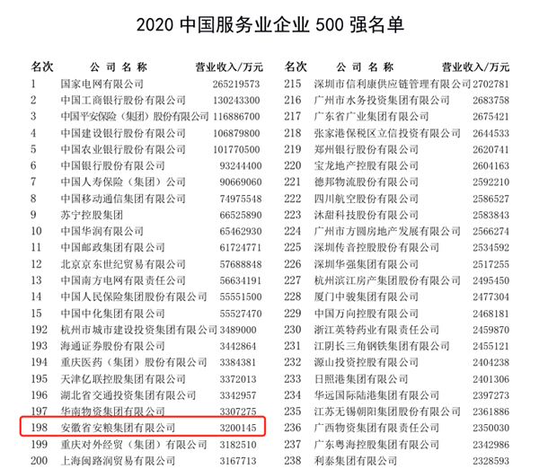 安糧集團(tuán)位列2020中國服務(wù)業(yè)企業(yè)500強(qiáng)第198位