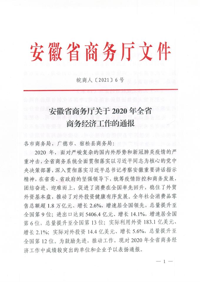 全省商務(wù)工作電視電話會議2021年1月21日上午在合肥召開。會上,省商務(wù)廳張箭廳長對2020年全省商務(wù)經(jīng)濟工作中成績較突出的單位和企業(yè)予以表揚通報。