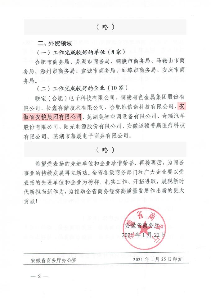 安糧集團獲省商務(wù)廳表彰