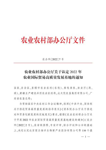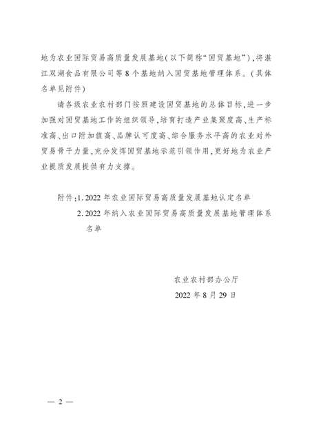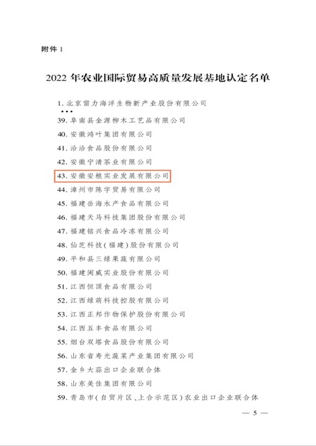 日前,農(nóng)業(yè)農(nóng)村部發(fā)布了《關(guān)于認(rèn)定2022年農(nóng)業(yè)國(guó)際貿(mào)易高質(zhì)量發(fā)展基地的通知》,經(jīng)省級(jí)推薦、專家評(píng)審、綜合評(píng)議和公示,認(rèn)定安徽安糧實(shí)業(yè)發(fā)展有限公司等116個(gè)基地為2022年農(nóng)業(yè)國(guó)際貿(mào)易高質(zhì)量發(fā)展基地。