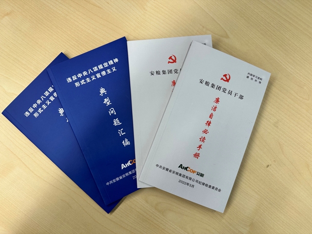會議還給每位新任職干部發(fā)放了《安糧集團(tuán)黨員干部廉潔從業(yè)必讀手冊》和《違反中央八項規(guī)定精神形式主義官僚主義典型問題匯編》。