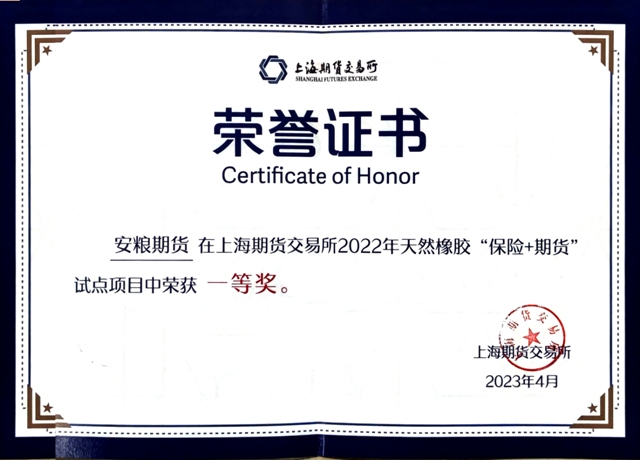 近日,上海期貨交易所對2022年天然橡膠“保險+期貨”試點(diǎn)項(xiàng)目進(jìn)行結(jié)項(xiàng)評審,安糧期貨在海南省樂東黎族自治縣開展的“保險+期貨”項(xiàng)目中表現(xiàn)優(yōu)異,榮獲2022年天然橡膠“保險+期貨”試點(diǎn)項(xiàng)目一等獎。