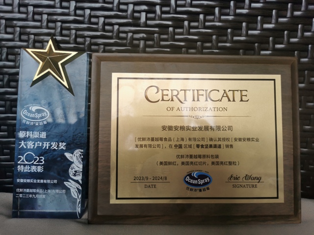 安糧實(shí)業(yè)獲得優(yōu)鮮沛品牌授權(quán),并榮獲“大客戶開(kāi)發(fā)獎(jiǎng)”,不僅是對(duì)安糧實(shí)業(yè)在休閑食品原料領(lǐng)域?qū)I(yè)性的認(rèn)可,也是對(duì)我司市場(chǎng)開(kāi)拓能力的信任。通過(guò)共享資源、互換優(yōu)勢(shì),安糧實(shí)業(yè)與優(yōu)鮮沛將共同推動(dòng)休閑食品行業(yè)的發(fā)展,為廣大消費(fèi)者帶來(lái)更多美味、健康的休閑食品,未來(lái)安糧實(shí)業(yè)與優(yōu)鮮沛的合作會(huì)讓更多客戶采購(gòu)到高品質(zhì)休閑食品原料和新鮮蔓越莓產(chǎn)品。