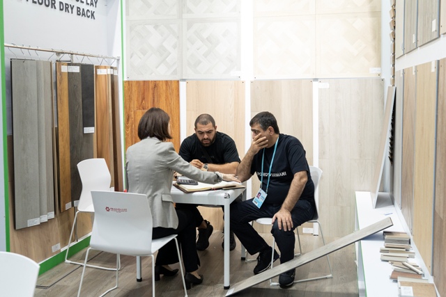 建材展位展品主要為室內(nèi)強(qiáng)化木地板、防水木地板、石塑SPC及WPC地板等。到訪客戶大多來自南美,也有部分中東、歐洲等國(guó)的新客戶。結(jié)合目標(biāo)市場(chǎng),業(yè)務(wù)部提前準(zhǔn)備了最新流行的木紋拼花地板等產(chǎn)品,其獨(dú)特的款式和顏色吸引了眾多新老客戶駐足洽談。