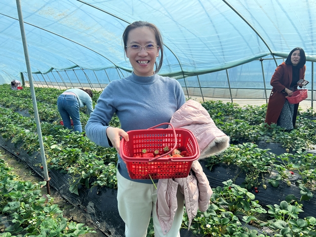 連片的草莓棚里,顆顆草莓飽滿、香甜,透著勃勃生機(jī),甜蜜的香氣撲鼻而來。大家按捺不住興奮的心情,提著小框穿梭在草莓田間精挑細(xì)選,或駐足合影、或互相幫助,不一會兒,筐子里已是碩果累累,收獲的喜悅溢于言表。采摘的同時(shí),果園負(fù)責(zé)人還為大家介紹了草莓品種、草莓的栽培方法和現(xiàn)代農(nóng)業(yè)發(fā)展?fàn)顩r。