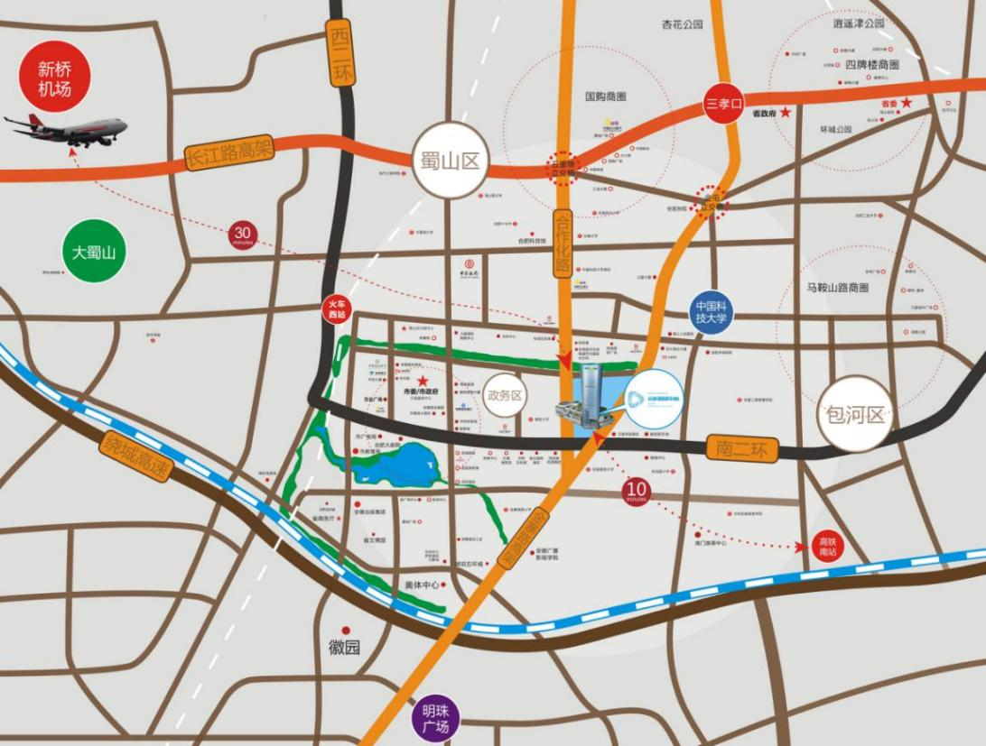 安糧國貿中心位于安徽省合肥市蜀山區(qū)金寨南路 811 號(金寨南路與南二環(huán)交口西北角),政務、蜀山與包河三區(qū)交匯的黃金核心,南二環(huán)、金寨路及合作化路三大主干道交匯的稀缺區(qū)位。合肥市政府政務中心、奧體中心、合肥大劇院構筑起集政務辦公、文化演藝、體育盛會、高端商務于一體的復合型價值生態(tài)圈,為項目注入源源不斷的消費動能與品質客群。